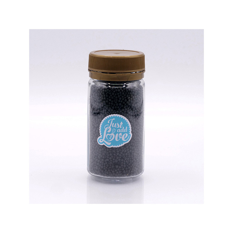 Missangas de açúcar de cor preta, com aproximadamente 1mm, para decoração de bolos, bolachas, cupcakes, cakepops, donuts, sobremesas e outras preparações.