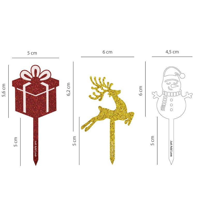 Topper de acrílico com espessura de 3mm, ideal para decoração de bolo rei, tronco de natal, cupcakes, bolos, sobremesas e outras especialidades de Natal. É lavável e reutilizável. Contém 3 elementos.