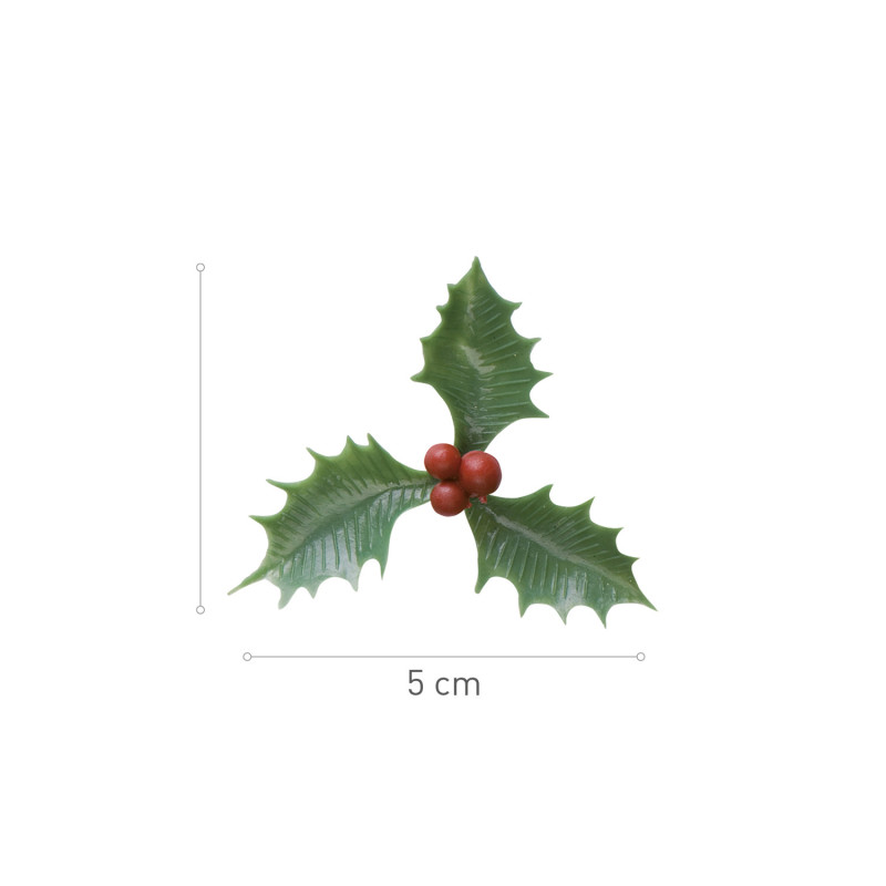 Folha de azevinho verde com bolas vermelhas.